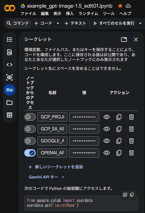取得した API キーを、Google Colab のユーザーデータに OPENAI_API_KEY という名前で保存します。