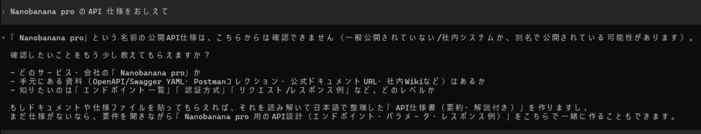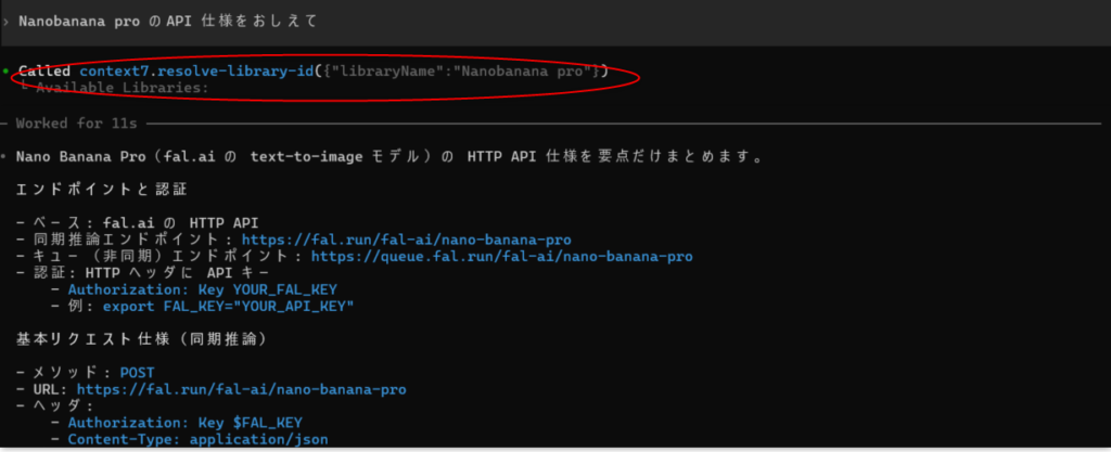 ”Nanobanana proのAPI 仕様をおしえて”という短い質問ですが “use context7″とつけるとMCP Context7 を利用して答えてくれますが、つけないと知らないと帰ってきます。