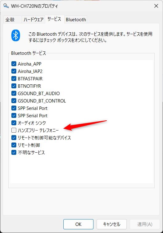 - 「サービス」タブに切り替え、「ハンズフリー テレフォニー」のチェックを外す