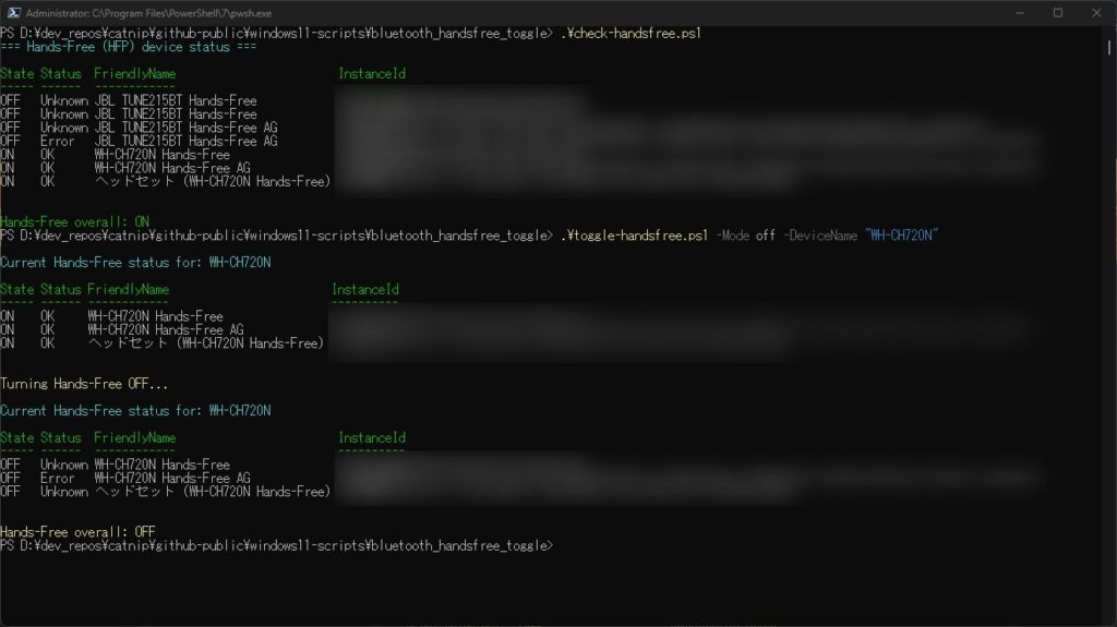 check-handsfree.ps1を実行し、対象デバイスの名称を確認する- 確認した名称を指定して
